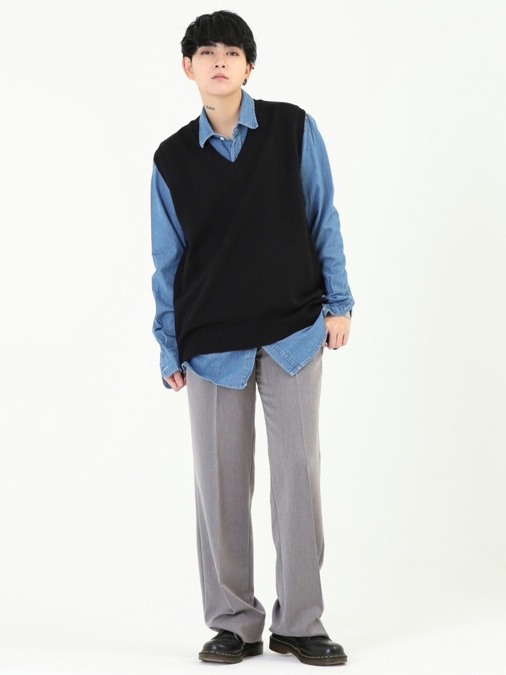 BOYSHEのベスト「Vネック ニットプルオーバーベスト ブラック」を使ったコーディネート