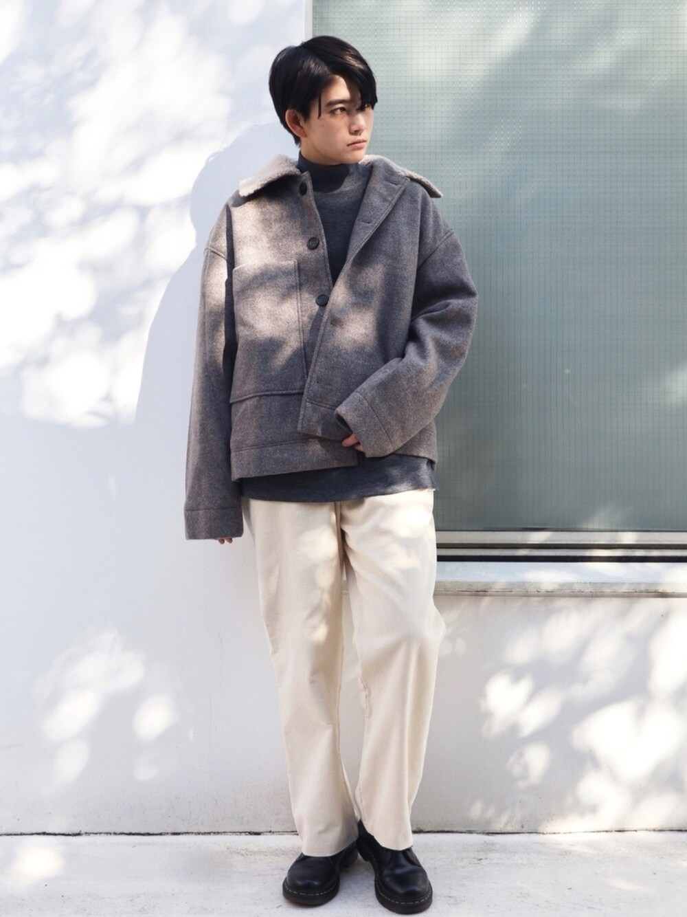ミニマルなデザインに羊毛でポイントを与えた独特の素材感のブルゾンジャケット。 フリースワイドカラーでフロントのビッグポケットデザインがユニークです。 コーデュロイ素材のテーパードパンツは股上深めのハイウエストタイプなので、脚長効果抜群。 身長:163cm Instagram@boyshe_official