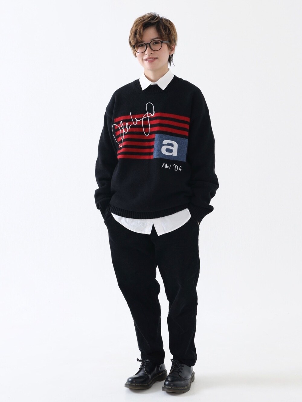 BOYSHEのニット/セーター「星条旗ラムウールクルーネックニット ブラック」を使ったコーディネート