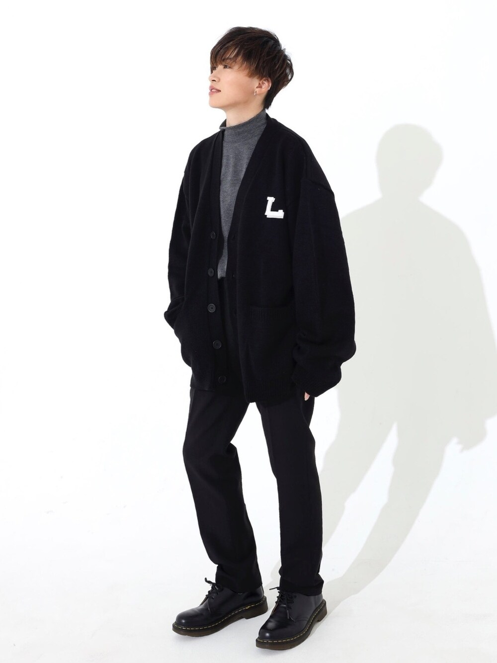 トップス: L字 アクリルカーディガン ブラック トップス: 高密度ニット ハイネックプルオーバー チャコールグレー【2 size】 パンツ: ストレートスラックス ブラック【2size】 身長:161cm Instagram@boyshe_official