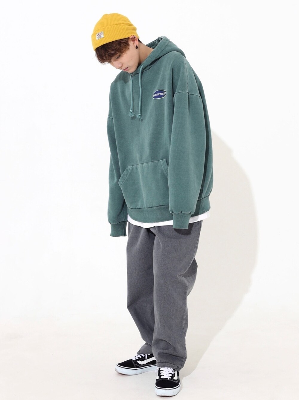 トップス: オーバーリング ピグメント裏起毛フードパーカー グリーン パンツ: デニムバギーバンディングパンツ チャコール 身長:163cm Instagram@boyshe_official