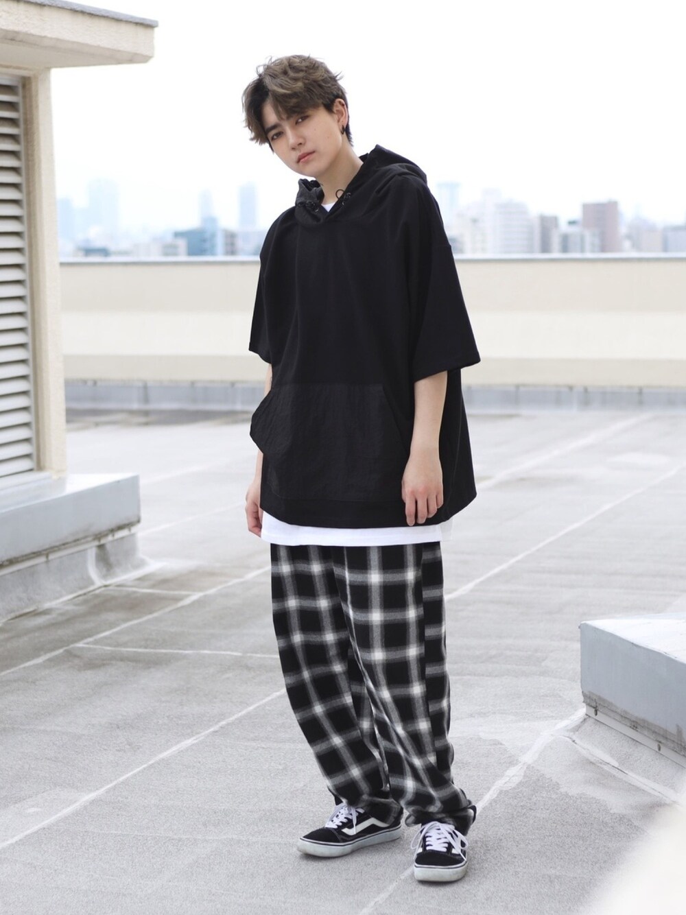 トップス: 切替半袖フードパーカー ブラック パンツ: チェック バンディング テーパードパンツ 身長:163cm Instagram@boyshe_official