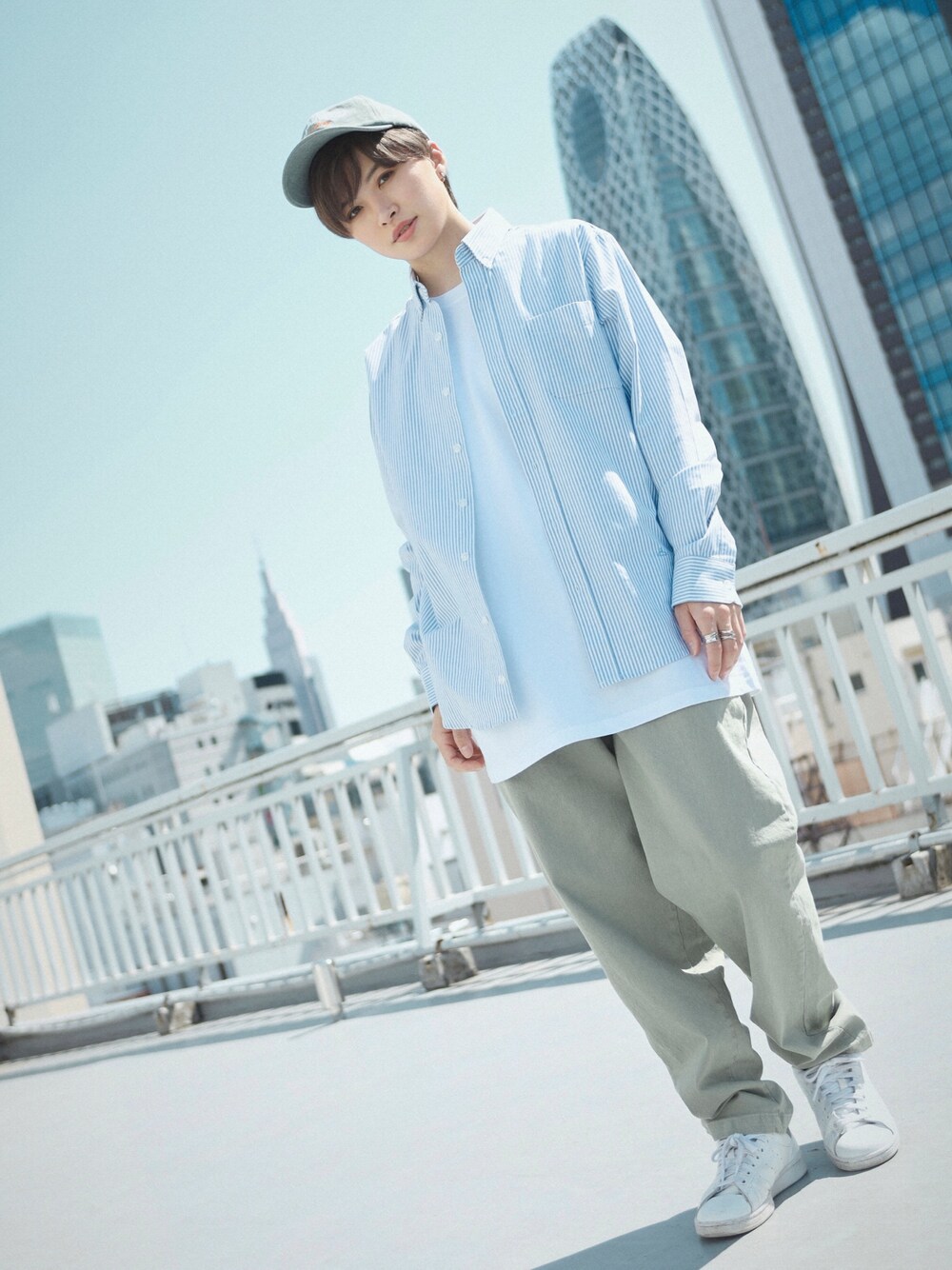 ・シャツ: オックスフォード ストライプシャツ【2 color/2 size】 ・トップス: 無地レイヤード 半袖Tシャツ ・パンツ: コットンストレッチ テーパードイージーパンツ カーキ 身長:161cm Instagram@boyshe_official