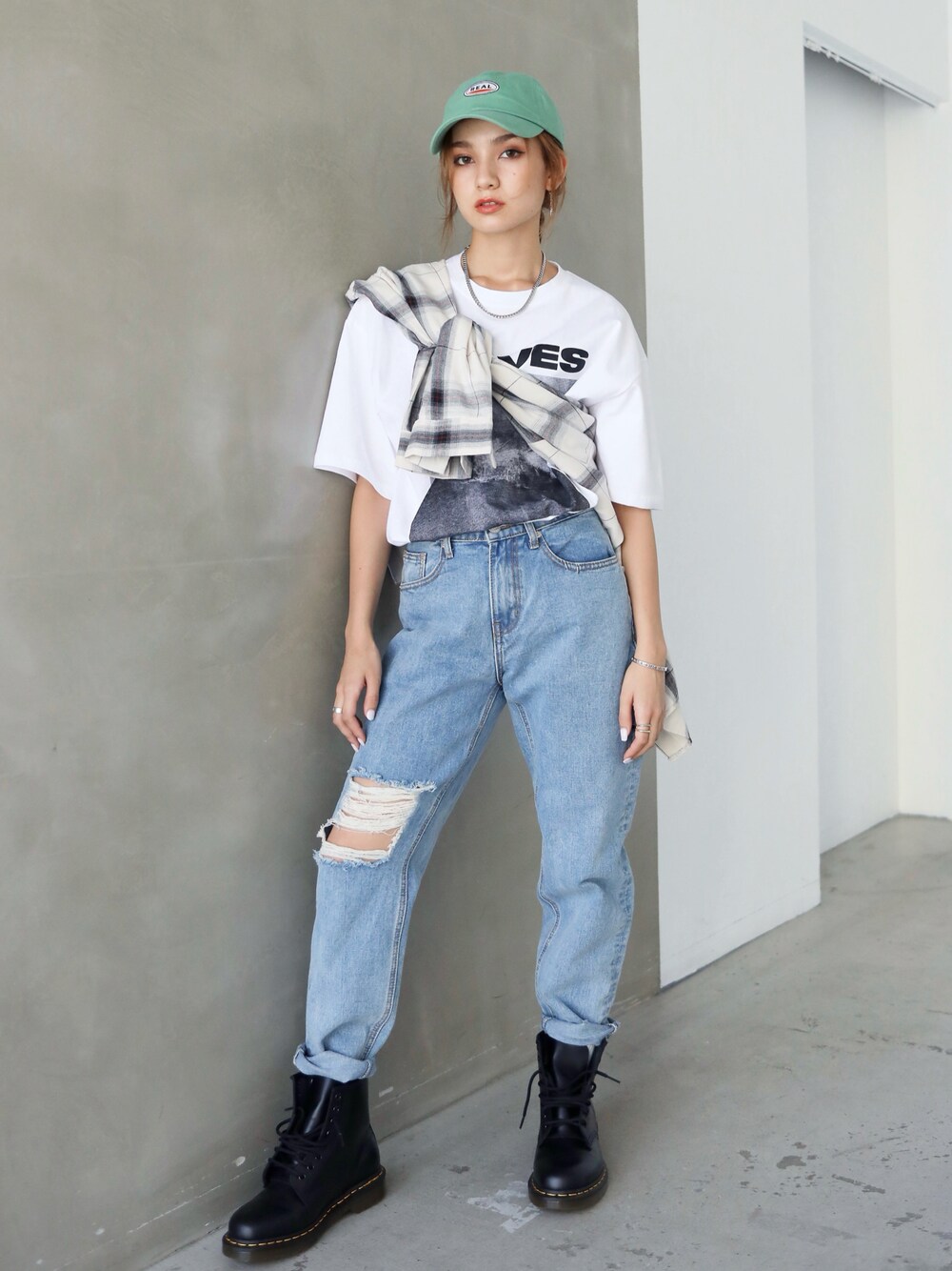 トップス: WAVES プリント半袖Tシャツ【2 color】 パンツ: ハイウェストストレートダメージデニムパンツ 裾カットオフ【3 size】 身長:163cm Instagram@boyshe_official