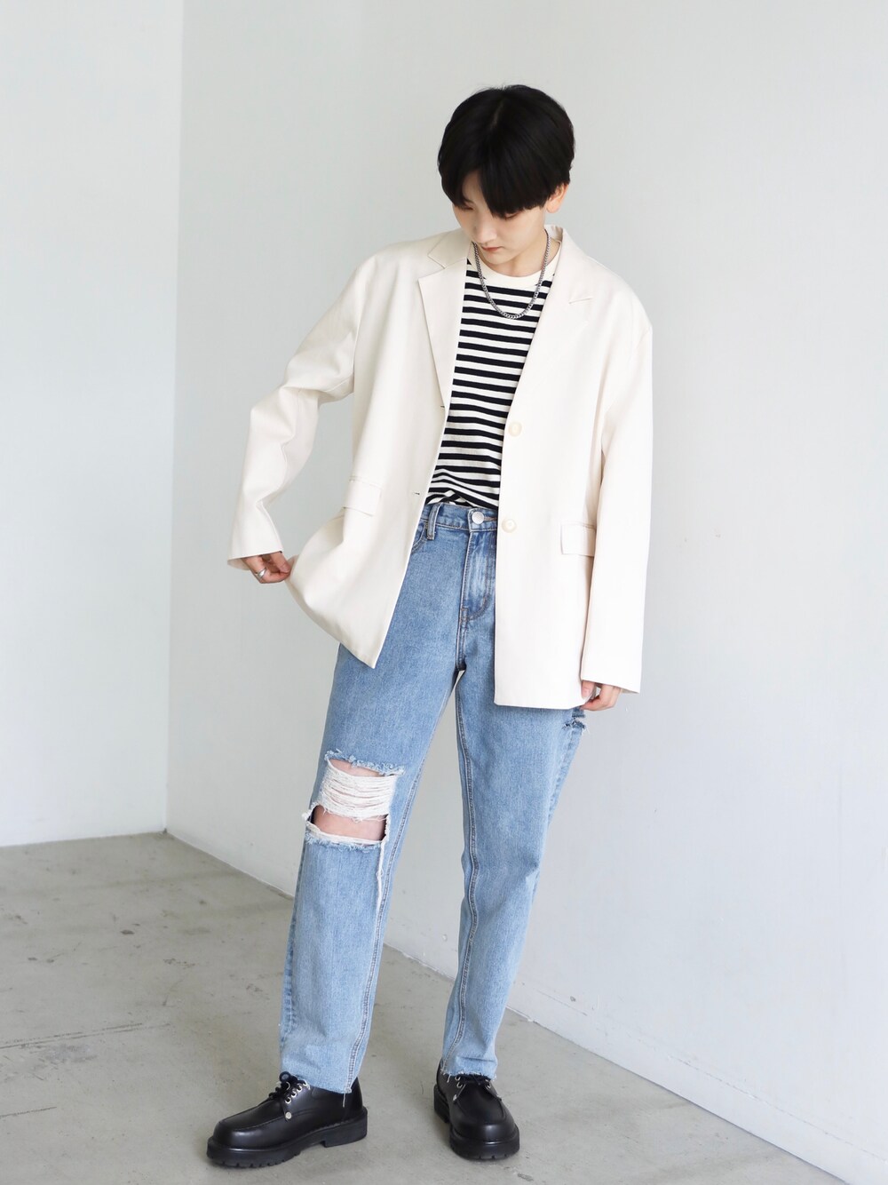 ジャケット: リヨセル/コットン ボックスシルエットテーラードジャケット ベージュ トップス: コットンボーダーTシャツ【4 color】 パンツ: ハイウェストストレートダメージデニムパンツ 裾カットオフ【3 size】 身長:163cm Instagram@boyshe_official