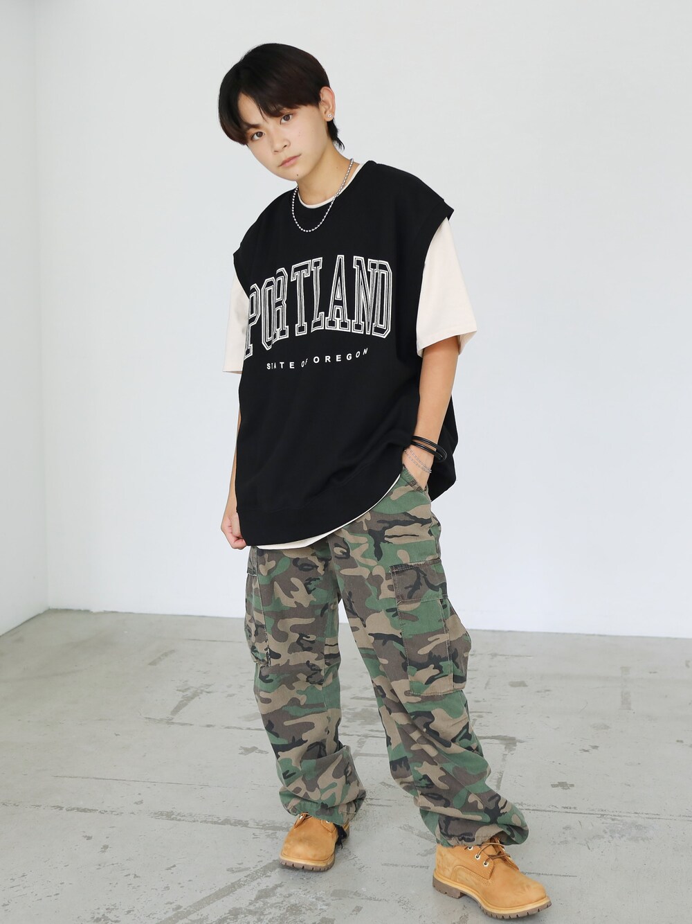 トップス: PORTLAND スウェットベスト【3 color】 シルケットコットン 半袖Tシャツ【3 color】 パンツ: 迷彩 ワイドストレート カーゴパンツ【2 color】 身長:153cm Instagram@boyshe_official