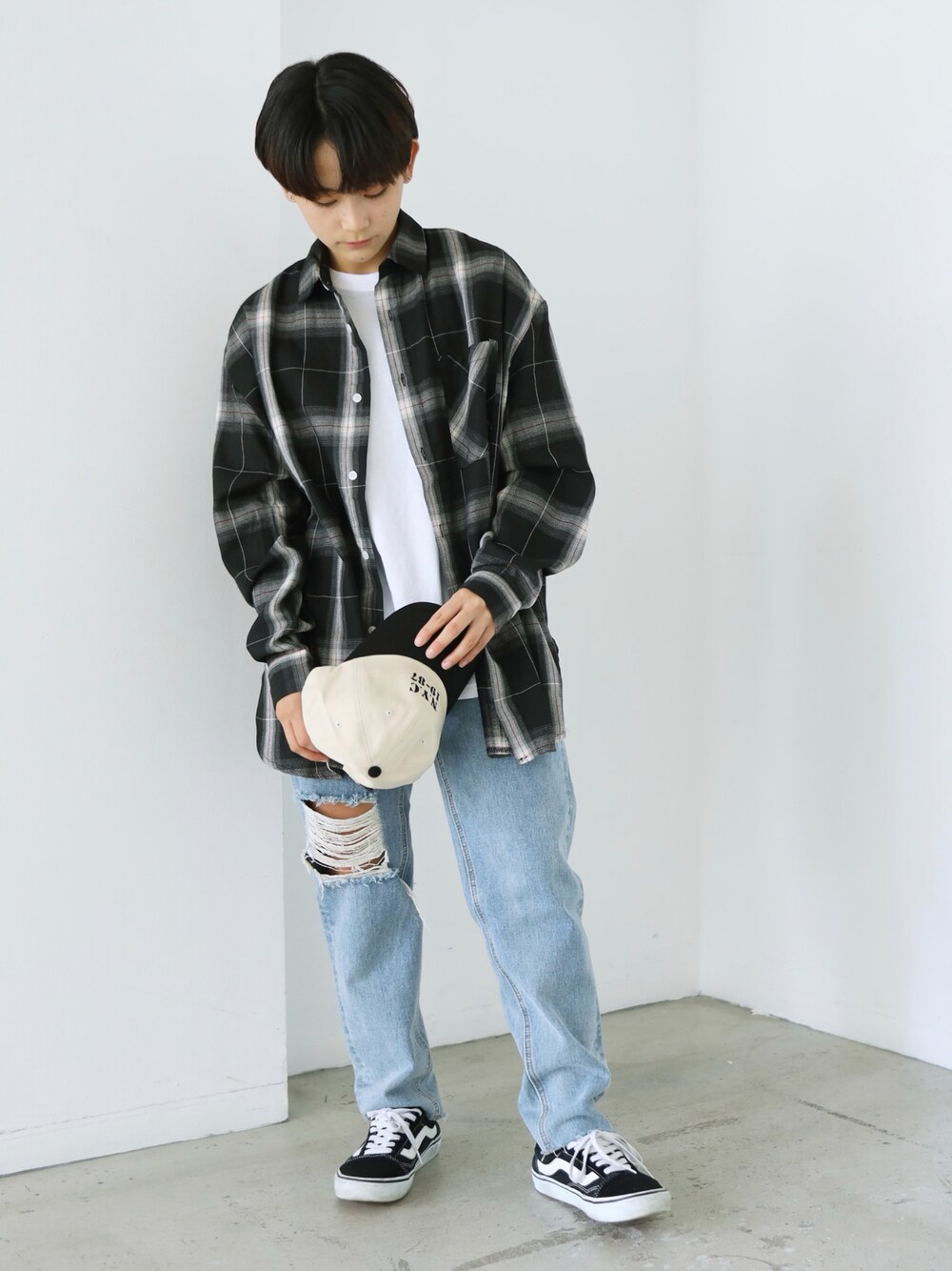トップス: チェック柄 長袖レギュラーカラーシャツ【3 color】 シルケットコットン 半袖Tシャツ【3 color】 パンツ:ハイウェストストレートダメージデニムパンツ 裾カットオフ【3 size】 身長:153cm Instagram@boyshe_official