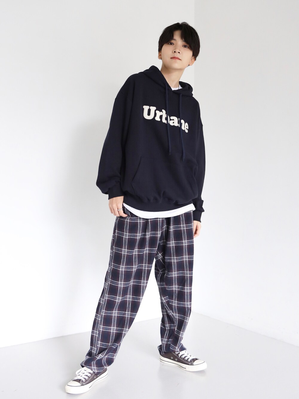 トップス: フードプルオーバー スウェットパーカー ネイビー パンツ: PEPE リラックス チェックシェフパンツ ネイビー Instagram@boyshe_official 身長:163cm