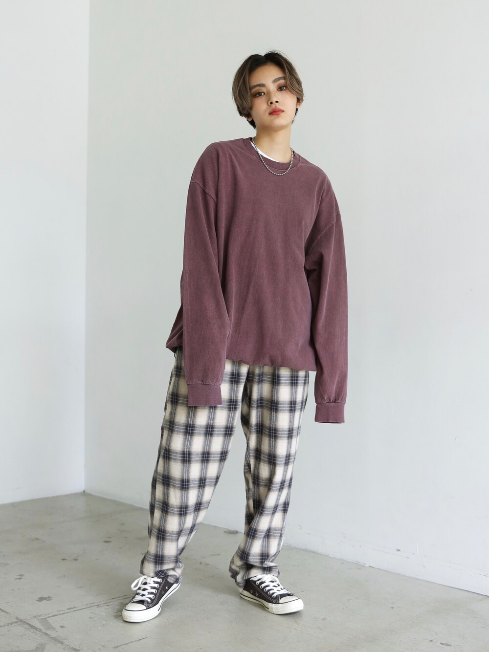 トップス: ピグメント ドローストリングロングTシャツ【3 color】 パンツ: PEPE リラックス チェックシェフパンツ ベージュ Instagram@boyshe_official 身長:160cm