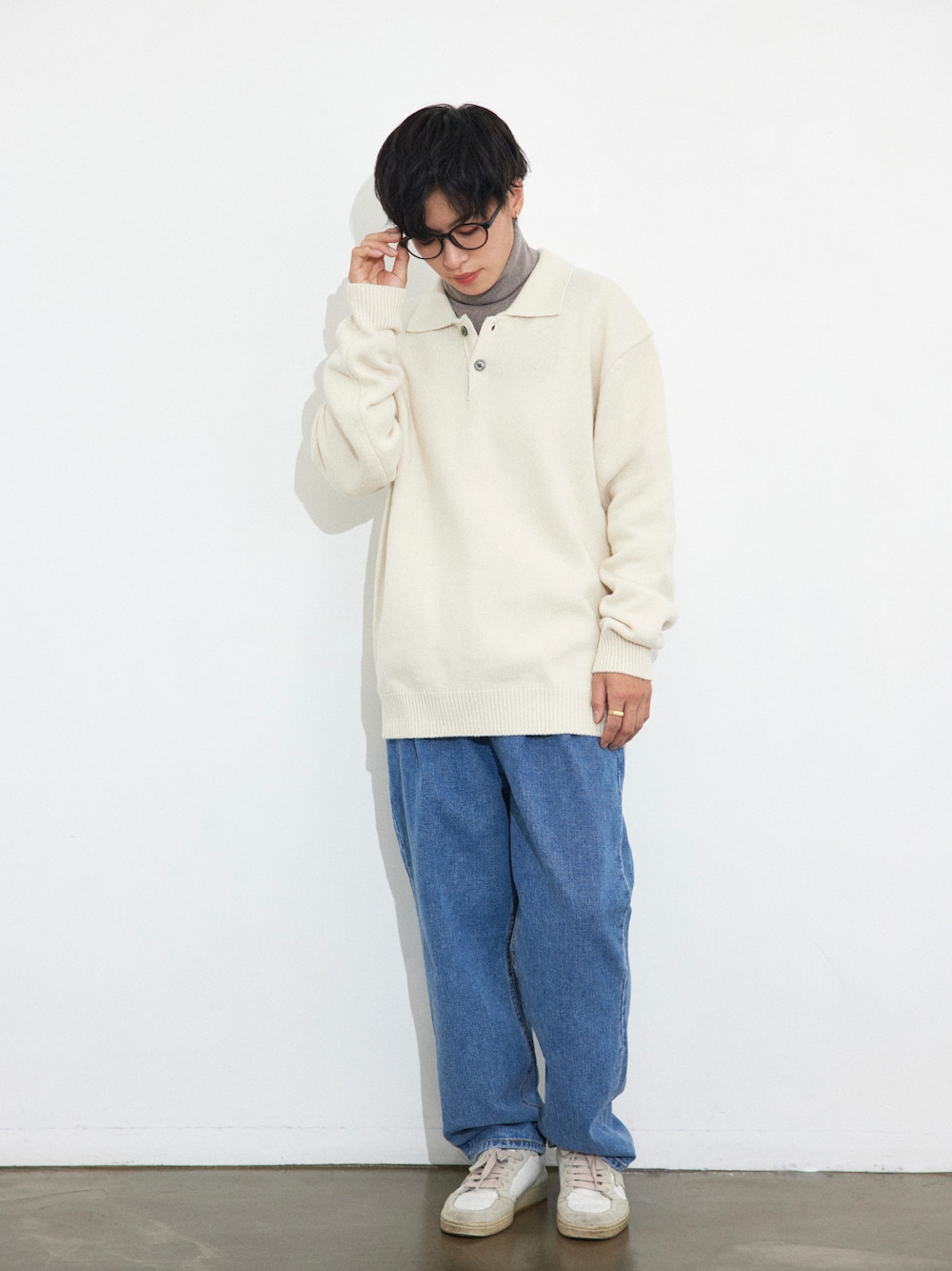 ・トップス: プレミアム ラムウール カラーニット【2 color】 ・パンツ: ダブルタック ワイド テーパードデニムパンツ 身長:161cm Instagram@boyshe_official