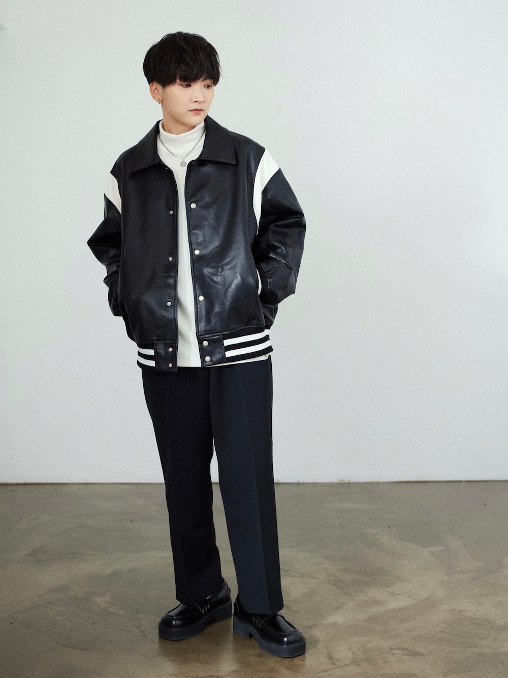 ・アウター: レザースタジアムジャケット ・パンツ: ワイドルーズスラックスパンツ 身長:163cm Instagram@boyshe_official