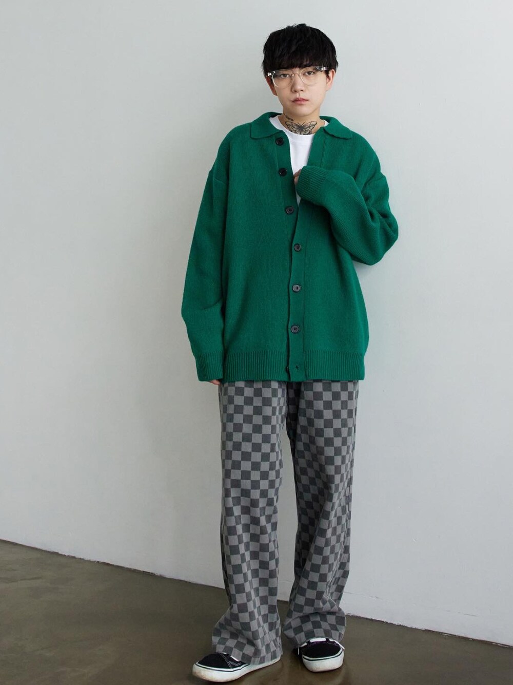 トップス: ラムウール オープンカラーカーディガン グリーン パンツ: チェックウォッシング加工 ビッグワイドパンツ 身長:163cm Instagram @boyshe_official
