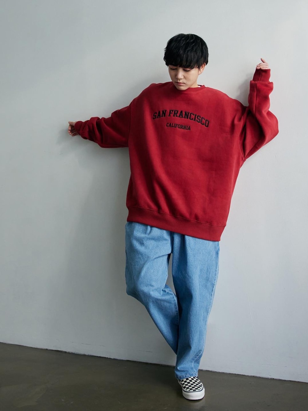 トップス: サンプランシスコ 裏起毛クルーネックスウェットMTM レッド パンツ: デニムバギーパンツ ブルー Instagram@boyshe_official 身長:163cm