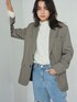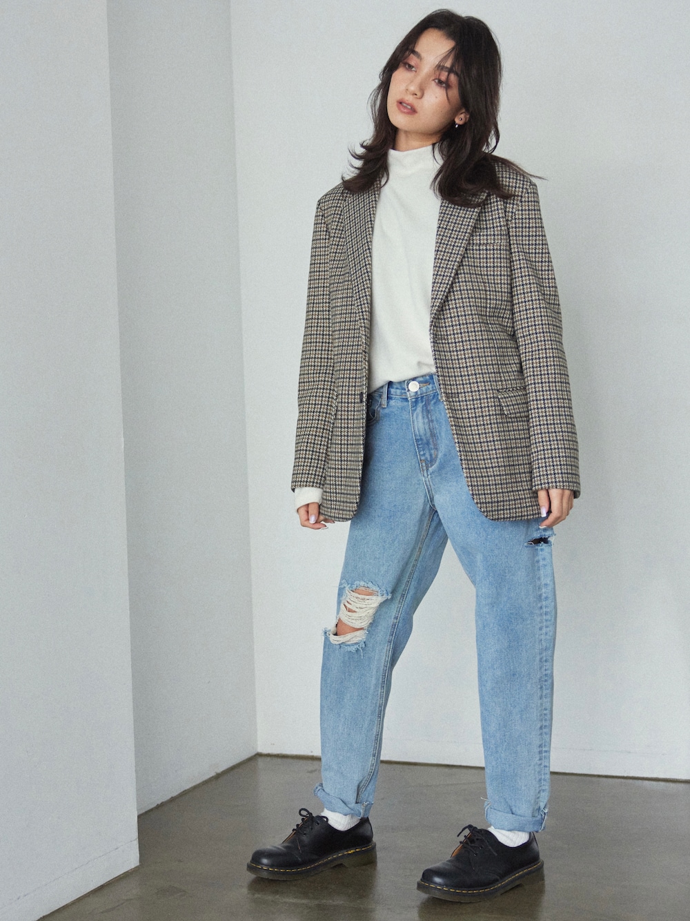アウター: ハウンドトゥース柄ジャケット【2 color】 パンツ: ハイウェストストレートダメージデニムパンツ 裾カットオフ【3 size】 Instagram@boyshe_official 身長:163cm