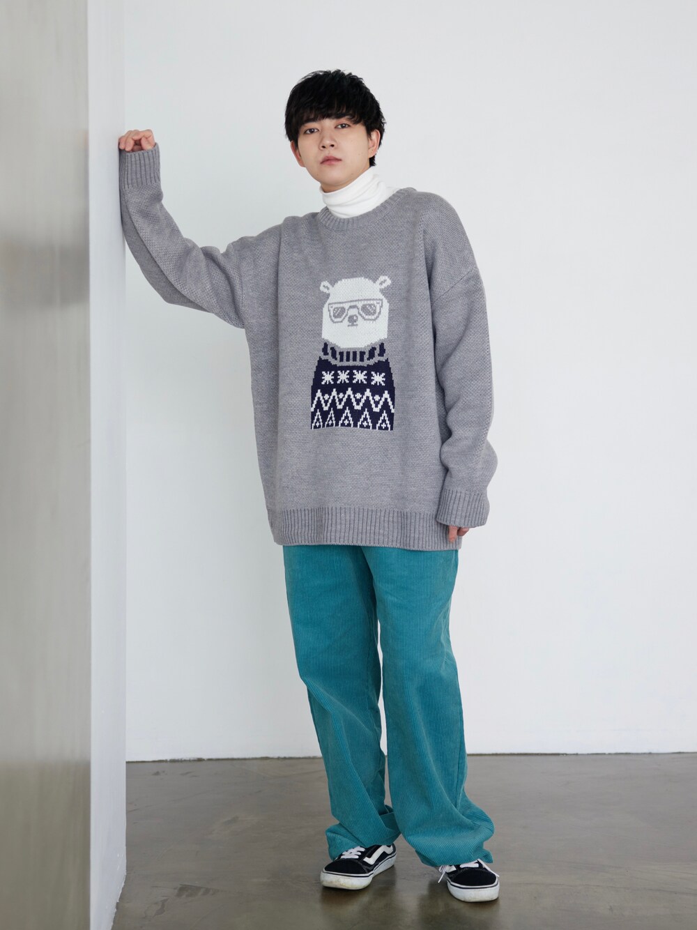 ・トップス: メガネベア クルーネックニット【2 color】 ・パンツ: コーデュロイ ビッグ ワイドパンツ【2 color】 身長:163cm Instagram@boyshe_official