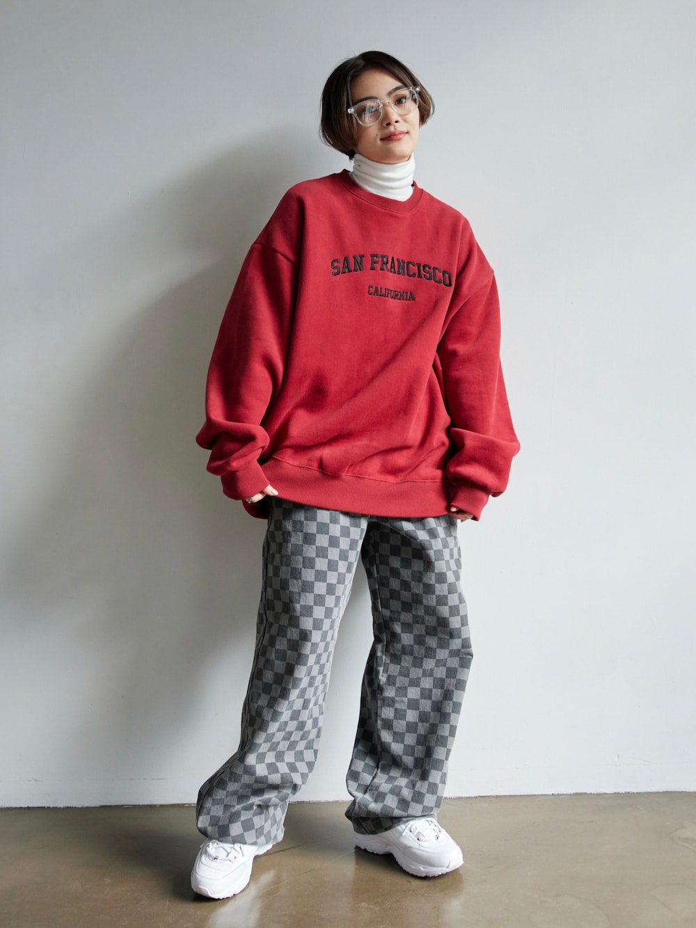 トップス: サンプランシスコ 裏起毛クルーネックスウェットMTM レッド パンツ: チェックウォッシング加工 ビッグワイドパンツ Instagram@boyshe_official 身長:163cm