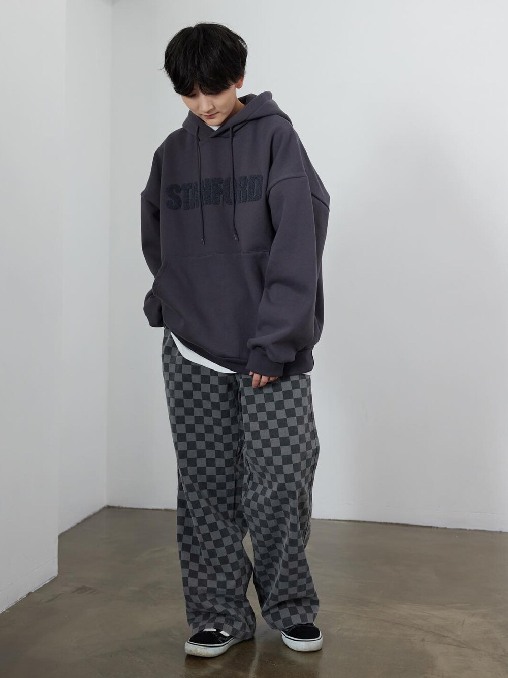 トップス:スタンフォード サガラ刺繍裏起毛パーカー【3 color】 パンツ:チェックウォッシング加工 ビッグワイドパンツ 身長:163cm Instagram@boyshe_official
