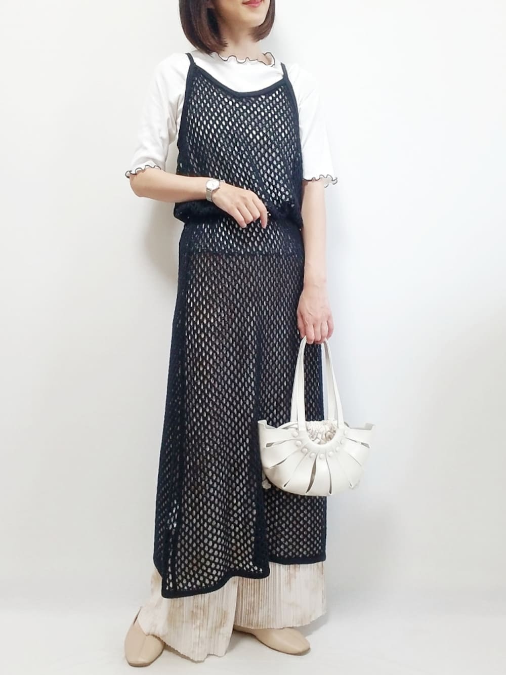 coen by SIZUのメッシュワンピース&メロウ5分袖Tシャツ2セットを着用してます☺ セットアイテムだから別々でも着られて着回しの幅があってとっても優秀です🤭 今回はセットで着たよ🎵 メッシュワンピースは丈が長いので長いまま着ても可愛いし、今回みたいにウエストマークしても丈を変えるのも良い感じです👏 肩紐は後ろでリボンにするデザインになっているので長さ調節も可能です😊 Instagram→rii.0409