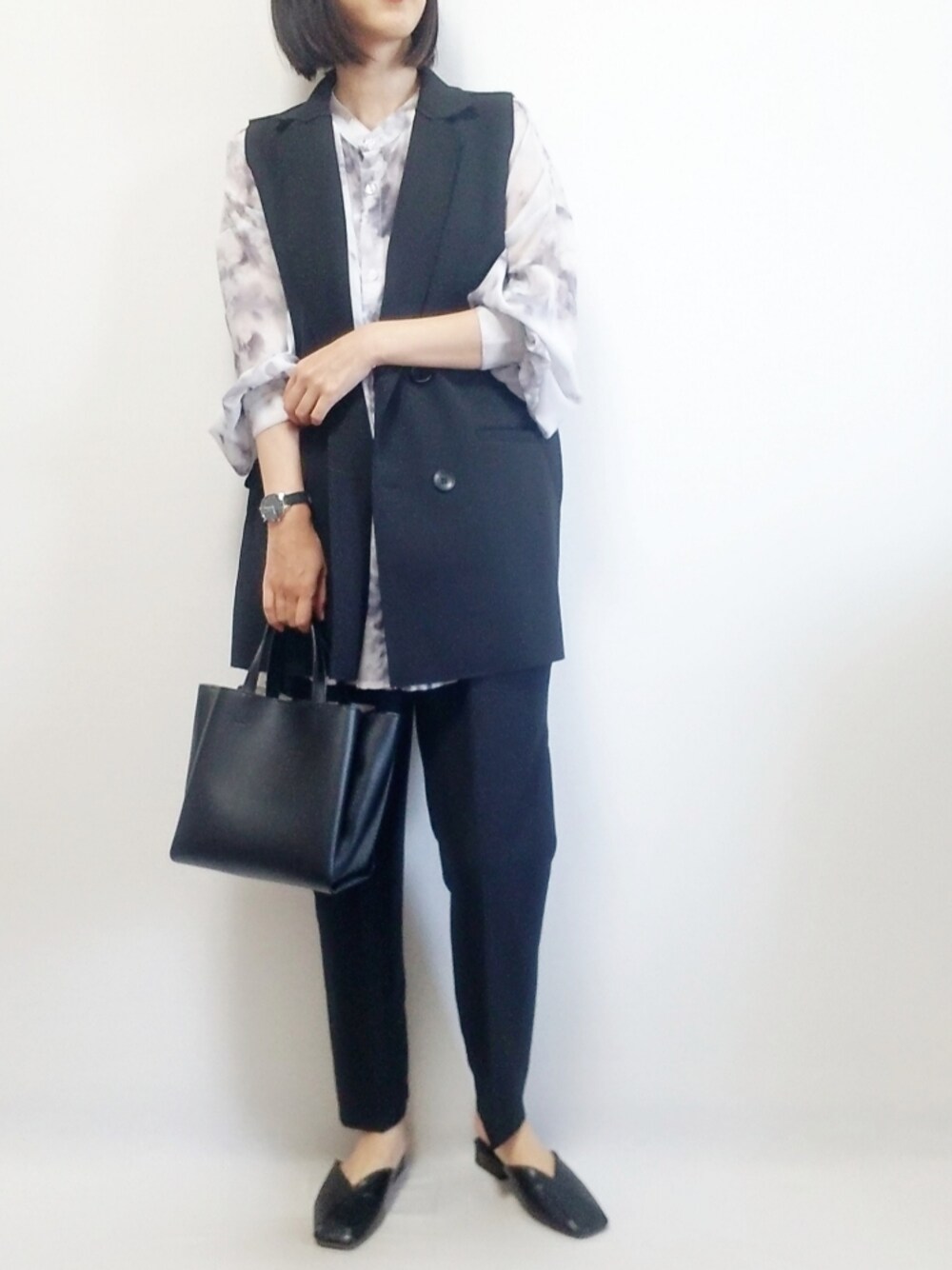 ECRIREのテーラーベスト着回し☺ またブラックパンツ合わせだけど、今回はテーパードにしました✨ 薄手のシャツで初秋でも着られるコーデ🤭 ベスト1枚羽織ればシンプルコーデのアクセントになって良いです👌 Instagram→rii.0409