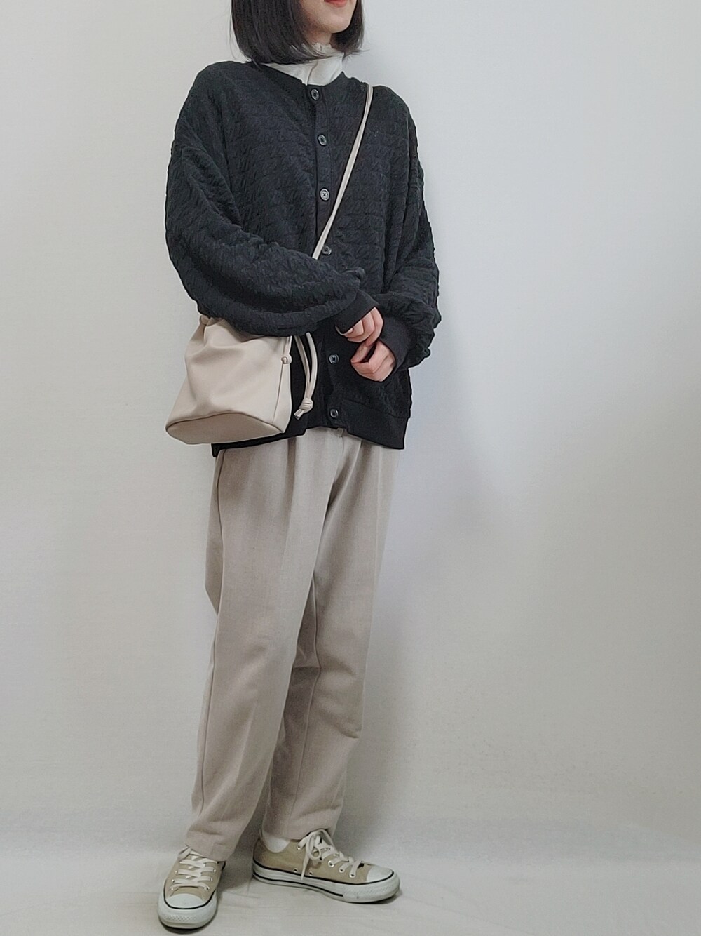 トップス→しまむら パンツ→GU 今日はちょっと肌寒い…☁️ カーディガンさりげなくポコポコになってて可愛いよ❤️ セールで安くなってたやつ😍 Instagram→rii.0409