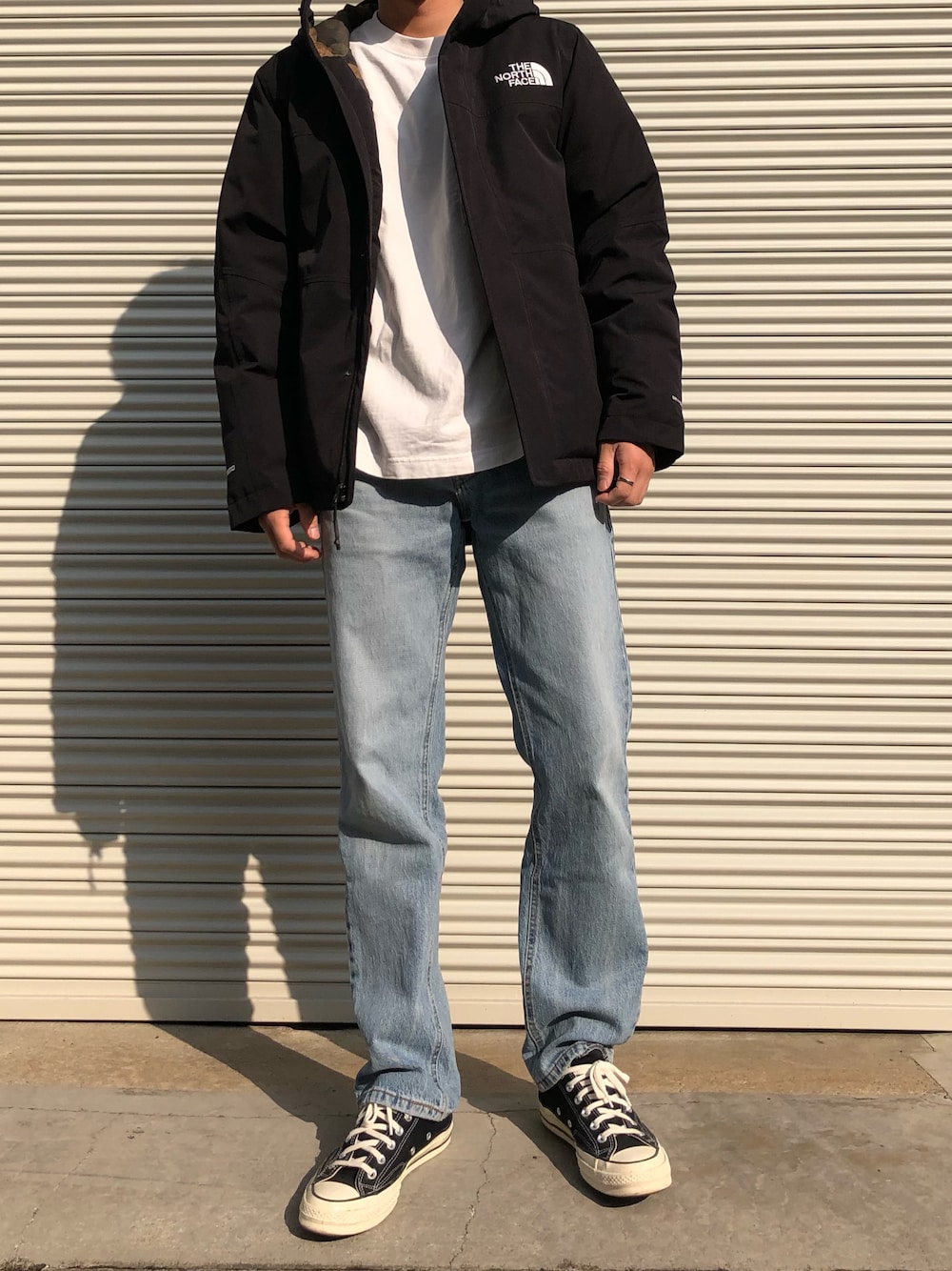 冬はダウンが欠かせないですよね。 黒アウター白トップスデニムconverse