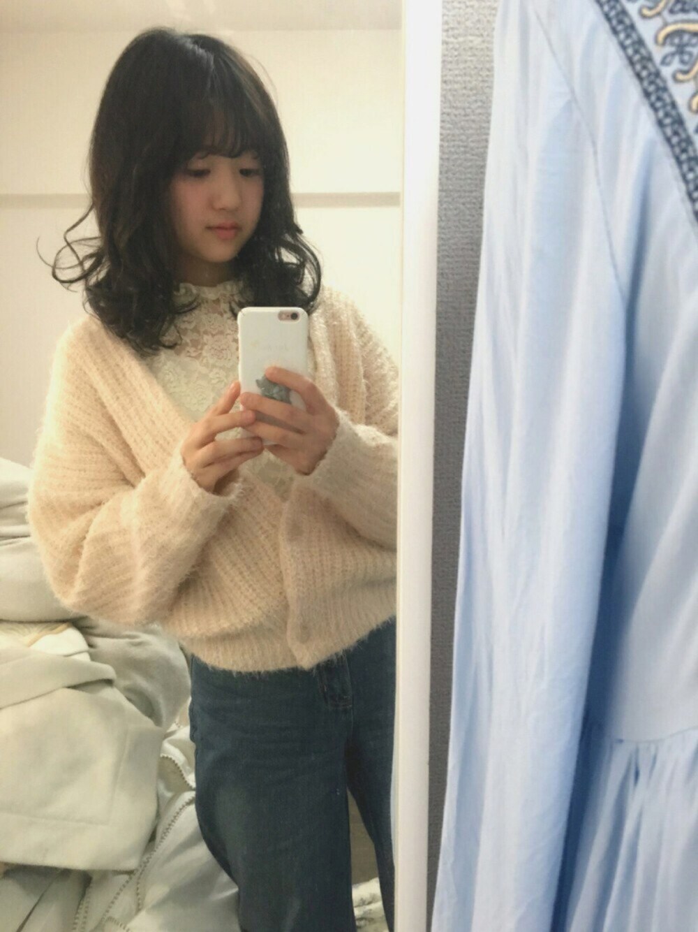 デニムはワイドです。髪の毛でなんとか抜け感を...