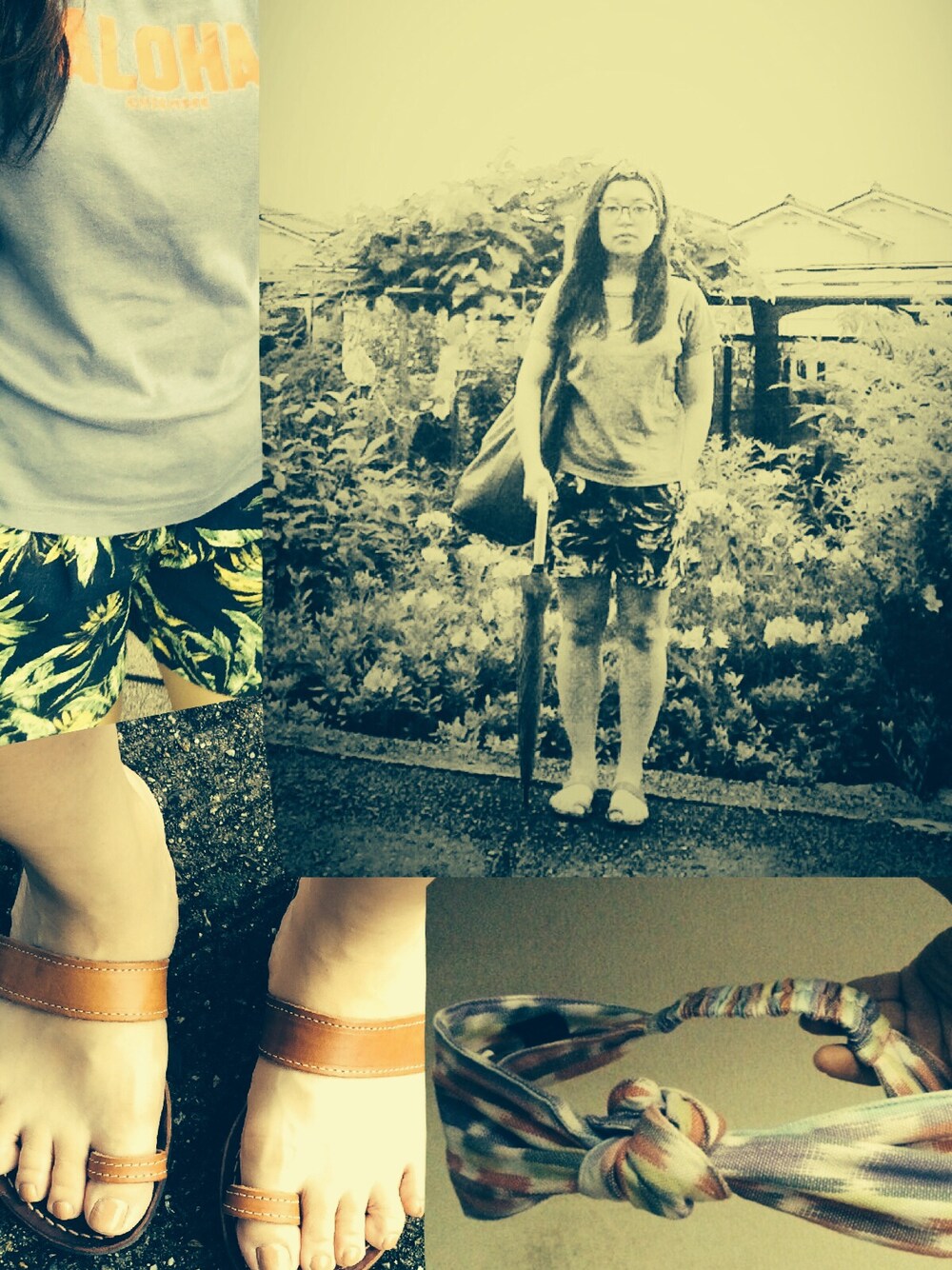 古着のお気に入りAloha Tシャツに、 フランスの手作り革靴屋で買った これでもかもいうほど、 シンプルなサンダル。