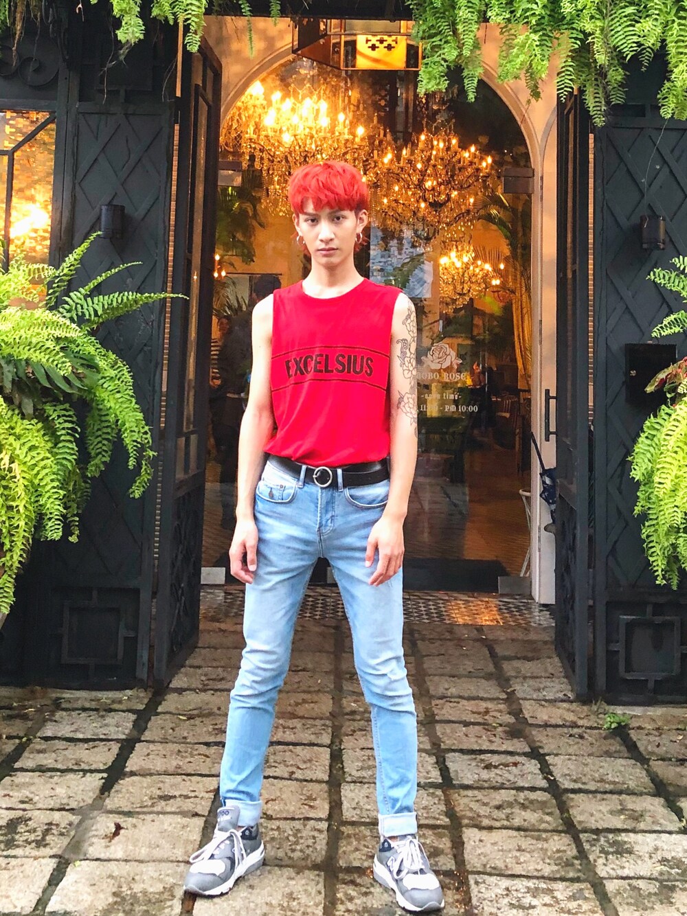 レッド系のTシャツ/カットソー、グレー系のスニーカーを着用したメンズの夏コーディネートの1枚目の写真