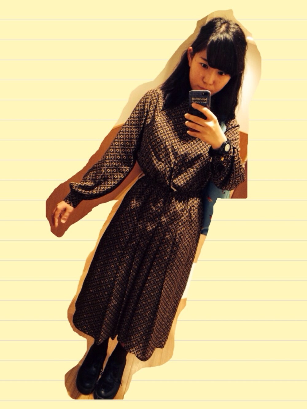 原宿のシカゴという古着屋さんで 一目惚れしたワンピースをさらっと一枚着! 茶色で、馬の歪の柄でオジカジュに決まりました。