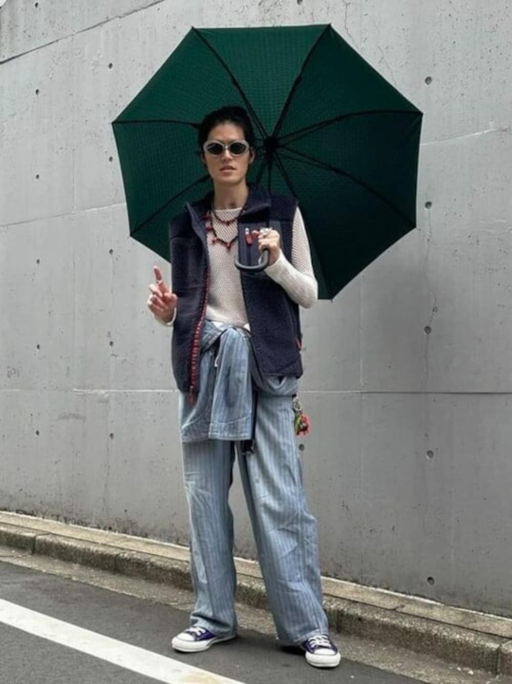 【177cm・細身・ベスト_Mサイズ着用】〈BLACKMEANS〉のメッシュロンt上に〈patagonia〉のベストを着ました。日中暖かく、夜は寒い日を予想してスタイリングしました。傘もファッションの一つです。