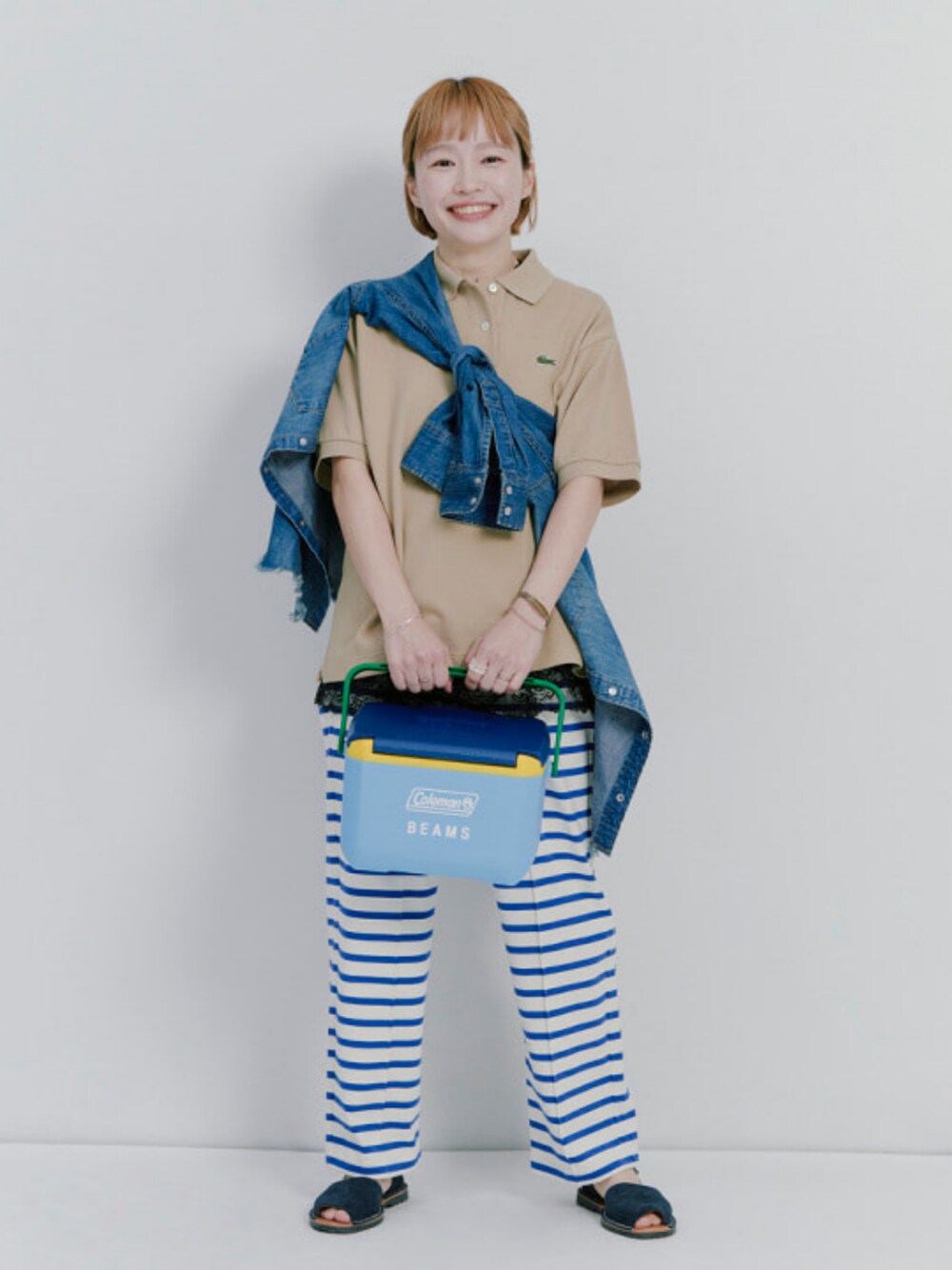 【153cm/小柄体型/骨格タイプナチュラル】 ポロシャツの少し真面目な印象のアイテムに、カジュアルなボーダーパンツとデニムの羽織りを組み合わせてラフ感を出しました。ポロシャツは透けにくく、しっかりした肉感でインナーアイテムのラインが気にならないのは春夏シーズンでは重宝しますね。 〈Coleman〉別注のクーラーBOXはニューモデルが登場!これはインテリアとしても置いておきたい可愛いさです〜!