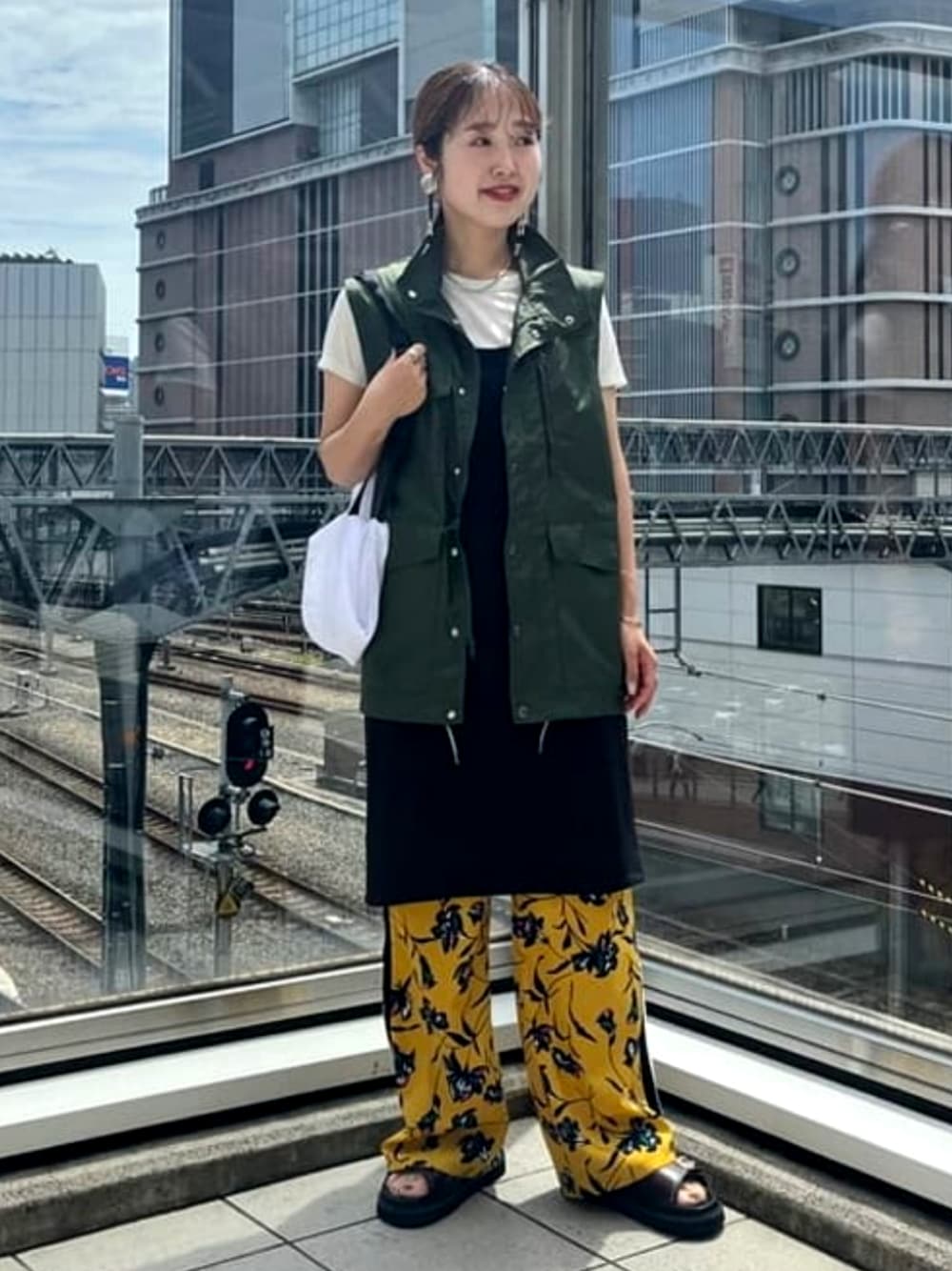 いつものスタイリングに〈SIERRA DESIGNS × BEAMS PLUS〉のベストを着用してみました!イエローとグリーンの色合わせが好きなので色はOLIVEをチョイス。立ち襟がかっこよくて、軽くて着心地抜群です〜♡