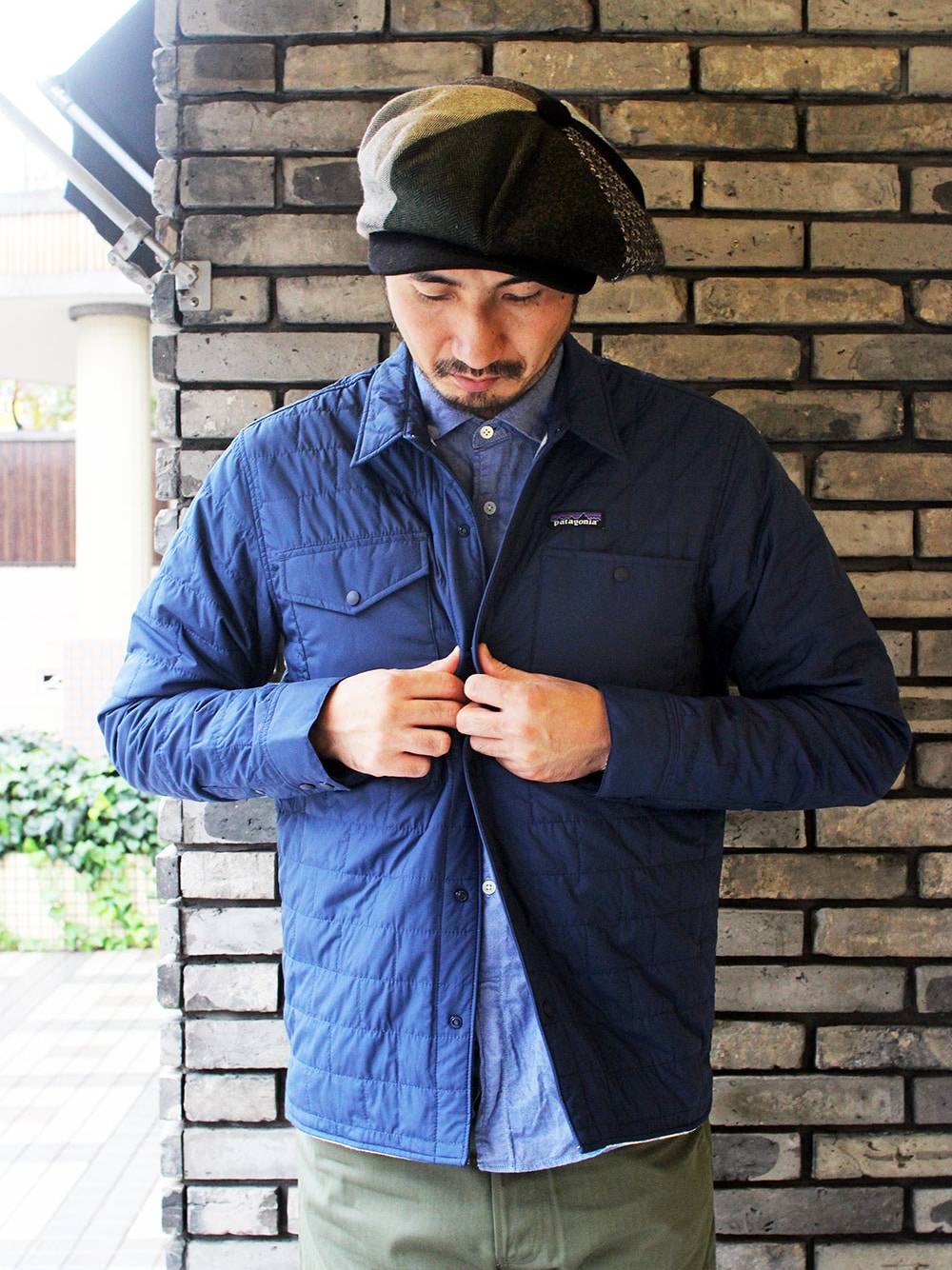 パタゴニアのナノ製品からヒントを得たシャツ型ジャケット。シェルにキルティングを施したDWR(耐久性撥水)加工済みの平織りのポリエステル、裏地に先染めのフランネル・ツイルを使用したリバーシブルのデザインで、60グラム・サーモグリーン・ポリエステルのインサレーション入り。