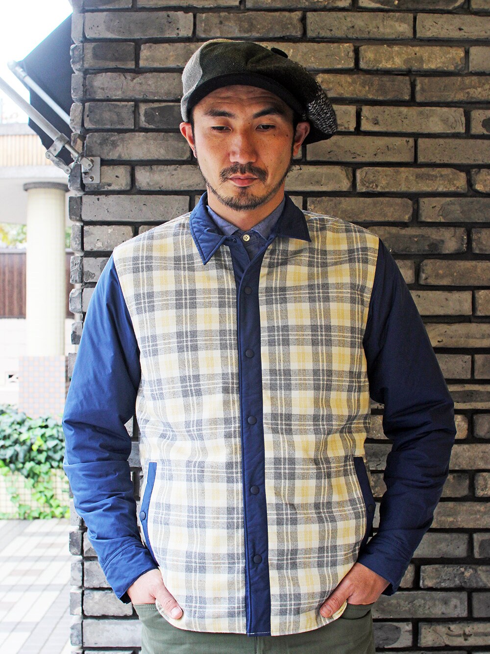 パタゴニアのナノ製品からヒントを得たシャツ型ジャケット。シェルにキルティングを施したDWR(耐久性撥水)加工済みの平織りのポリエステル、裏地に先染めのフランネル・ツイルを使用したリバーシブルのデザインで、60グラム・サーモグリーン・ポリエステルのインサレーション入り。