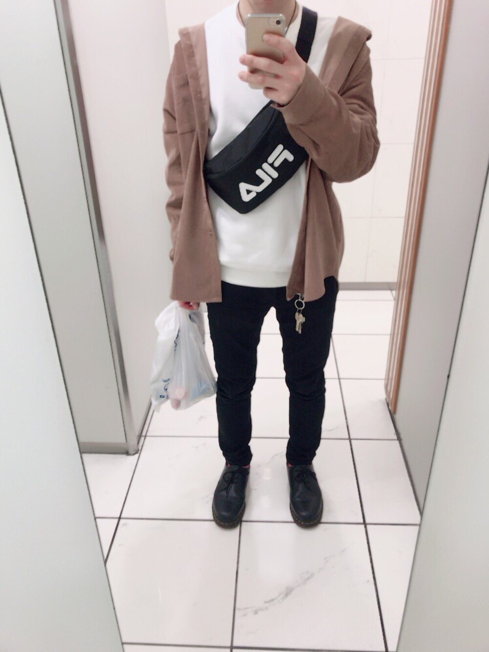 こんばんはー! 久々の投稿です!! この前FUNでレディースのピンクブラウン系のロングシャツを買ったので 今日着てみましたー! スキニーを穿いてシルエットもいい感じ〜! FILAのウエストポーチでスポーティー感も!