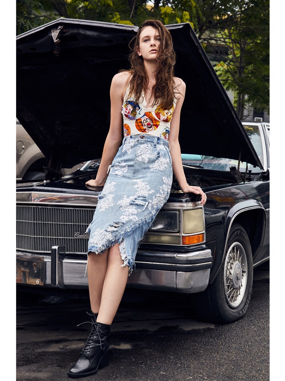 Clown-Printed Silk Crēpe de Chine Bodysuit with Hand-Appliqué Vintage Lace Distressed Denim Skit.