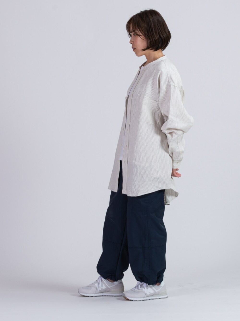 ゆったりしたオーバーサイズシャツを着用した流行コーデ。 リネンデニム生地特有の風合いがポイントです。 ユニセックスで着用できるのでおそろコーデにもおすすめ!