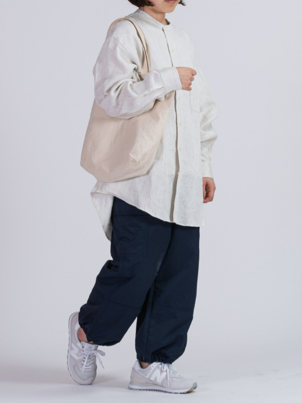 ゆったりしたオーバーサイズシャツを着用した流行コーデ。 リネンデニム生地特有の風合いがポイントです。 ユニセックスで着用できるのでおそろコーデにもおすすめ!