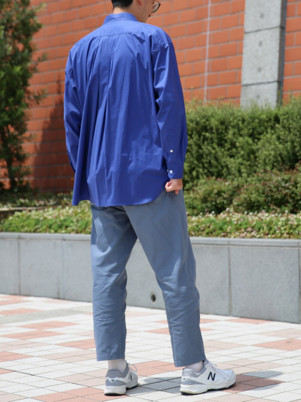 ゆったりしたオーバーサイズシャツを着用した流行コーデ。 フロントはシンプルなデザインですが、背面のバックプリーツが個性を演出してくれます☆ ユニセックスで着用できるのでおそろコーデにもおすすめです!