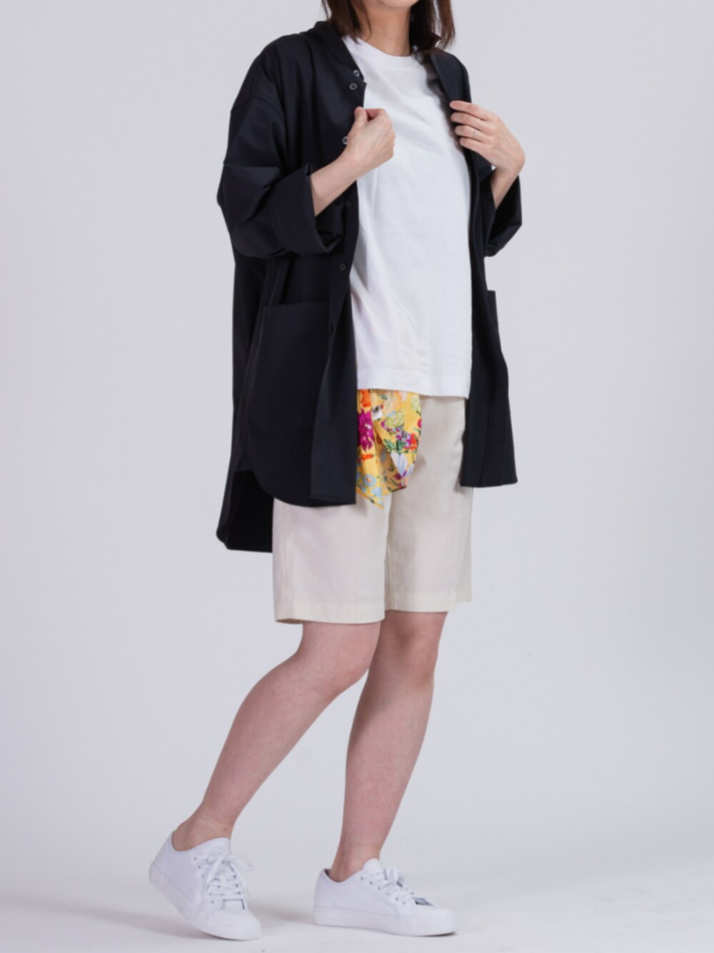 ゆったりしたオーバーサイズシャツを着用した流行コーデ。 タウンユースはもちろん、アウトドアシーンでもOK。 ユニセックスで着用できるのでおそろコーデにもおすすめです!