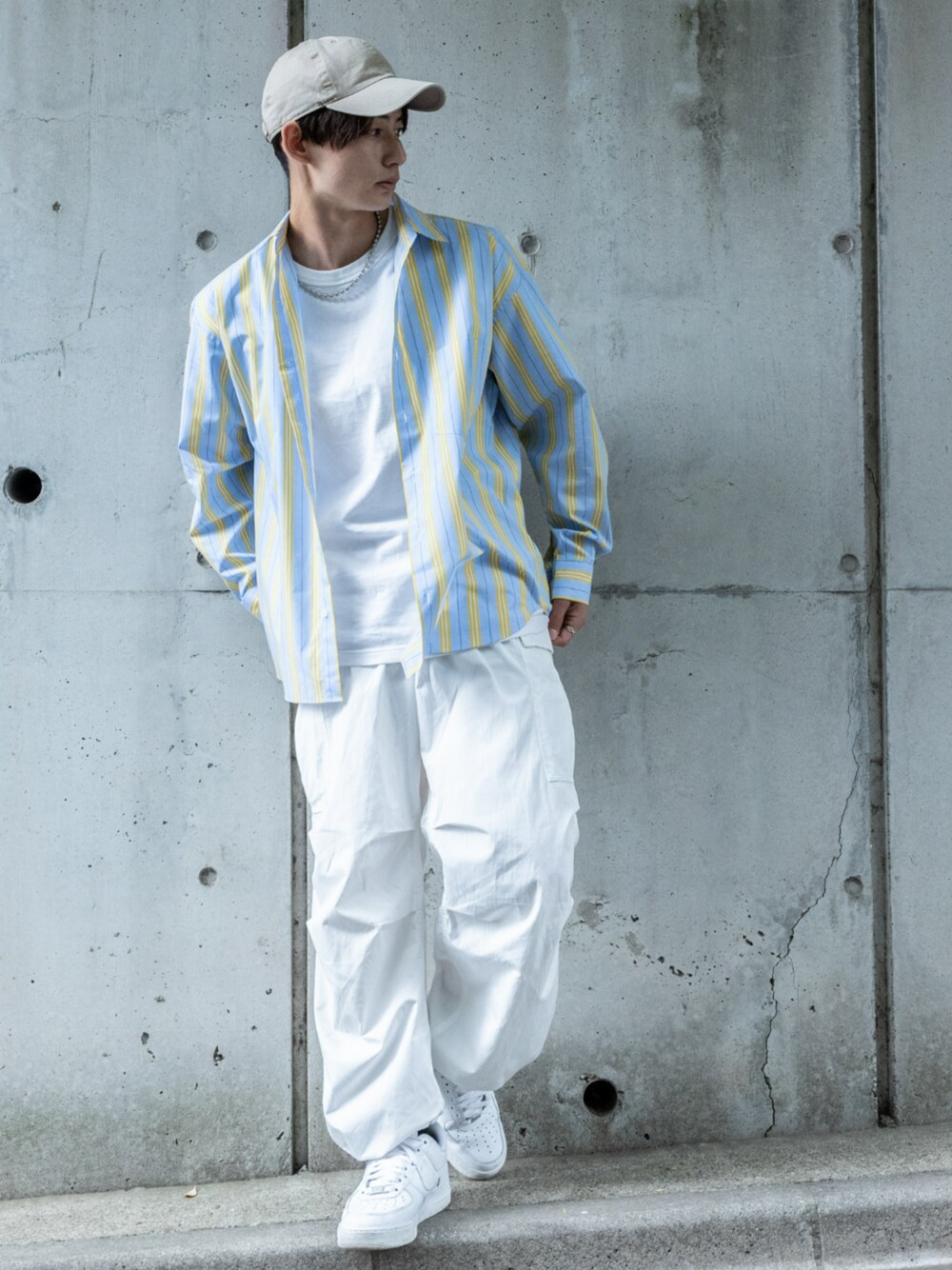 ゆったりしたオーバーサイズシャツを着用した流行コーデ。 フロントはシンプルなデザインですが、背面のバックプリーツが個性を演出してくれます☆ ユニセックスで着用できるのでおそろコーデにもおすすめです!