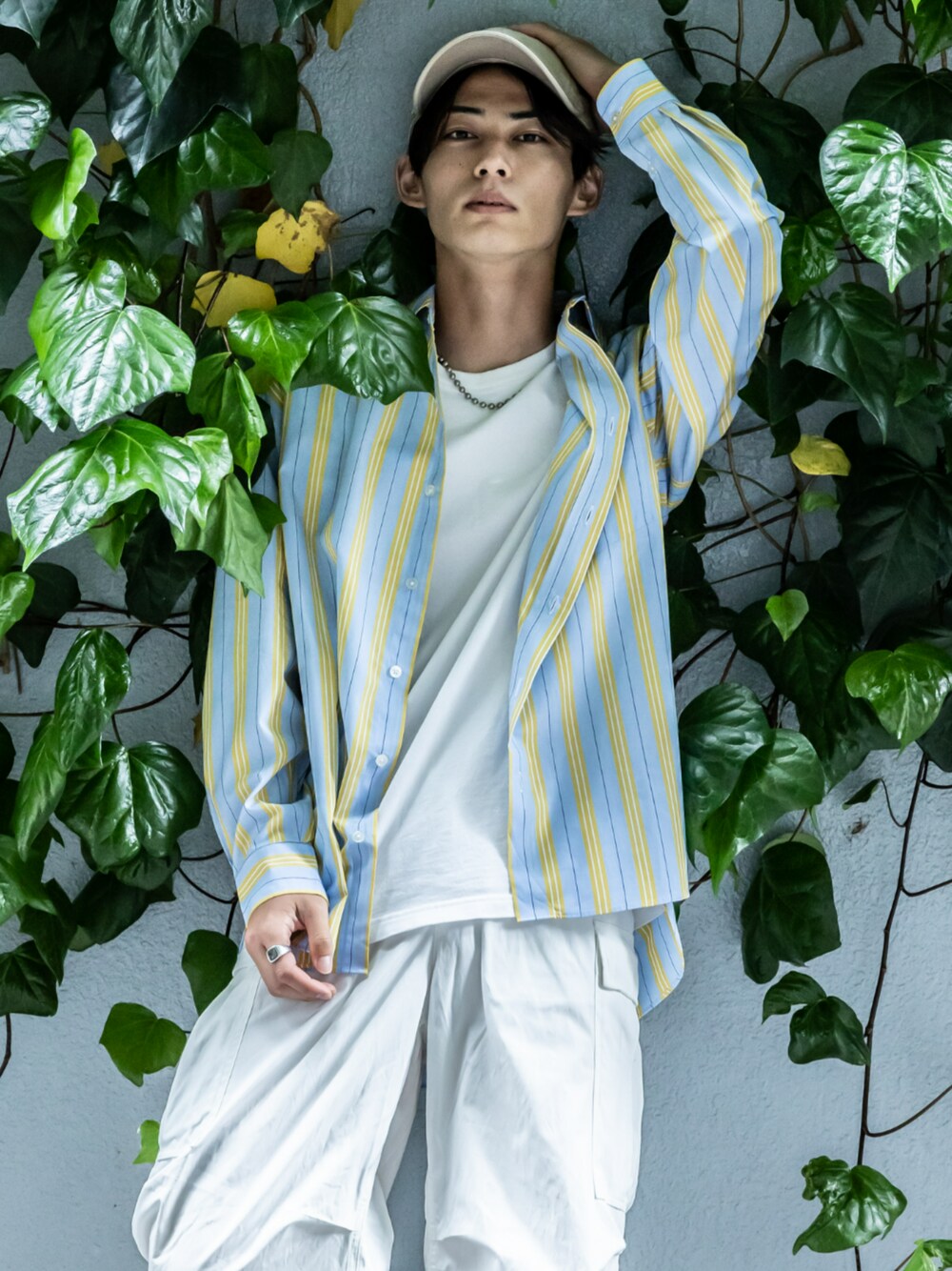 ゆったりしたオーバーサイズシャツを着用した流行コーデ。 フロントはシンプルなデザインですが、背面のバックプリーツが個性を演出してくれます☆ ユニセックスで着用できるのでおそろコーデにもおすすめです!