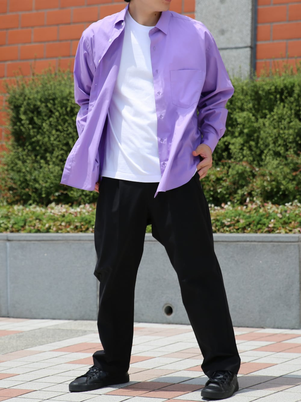ゆったりしたオーバーサイズシャツを着用した流行コーデ。 フロントはシンプルなデザインですが、背面のバックプリーツが個性を演出してくれます☆ ユニセックスで着用できるのでおそろコーデにもおすすめです!