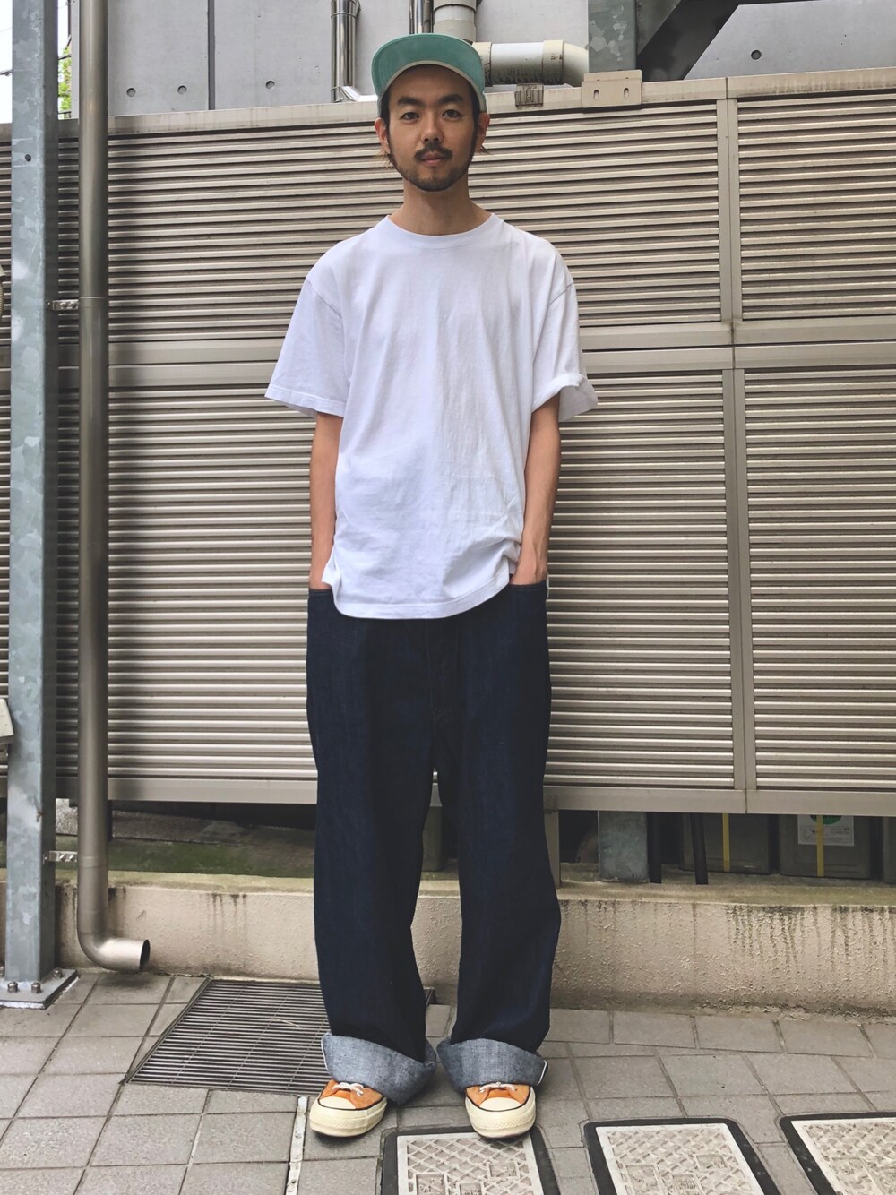 HenderScheme のwater proof jet capに白T ワイドデニムパンツはJIMMY&SONS OVERALLS ワイドデニムパンツは気に入りすぎてサイズ違いで2本購入👖