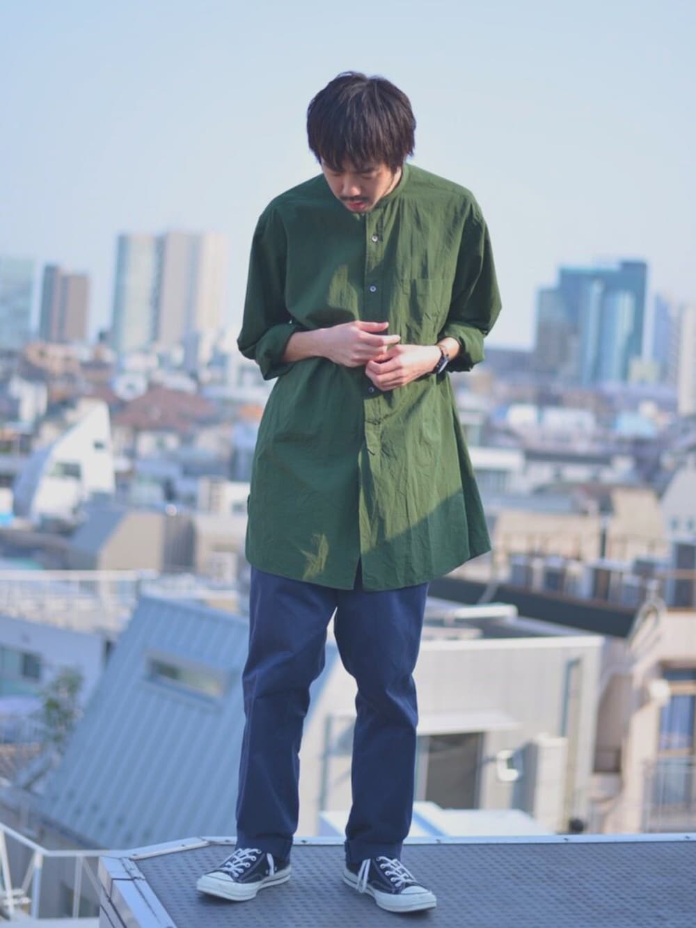 comoliのバンドカラーシャツのグリーンがいい色でお気に入りです。 ご予約お待ちしております!