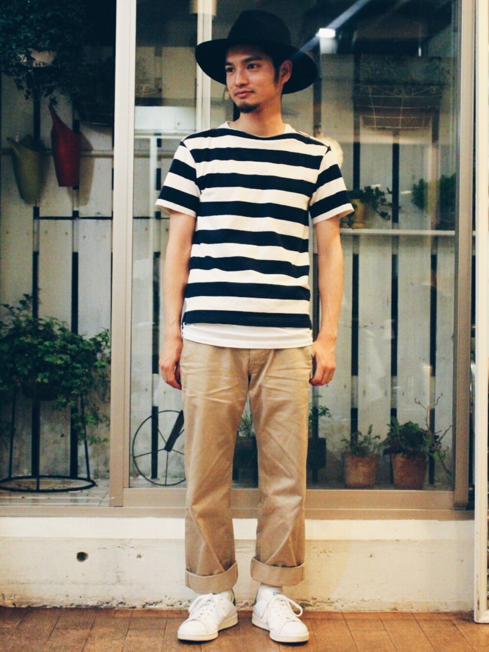 ネイビーのハットとscyeのボーターを合わせて夏らしさを☺︎チノパンにスタンスミスを合わせるのが好き◎