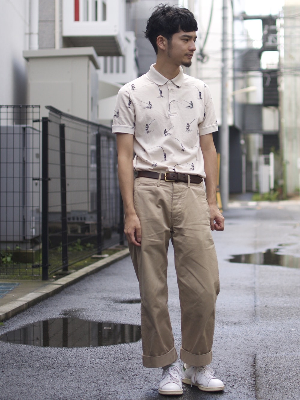 フィッシャーマンモチーフのポロシャツをSCYEのチノパンにインして☺︎ スタンスミスははずしません◎
