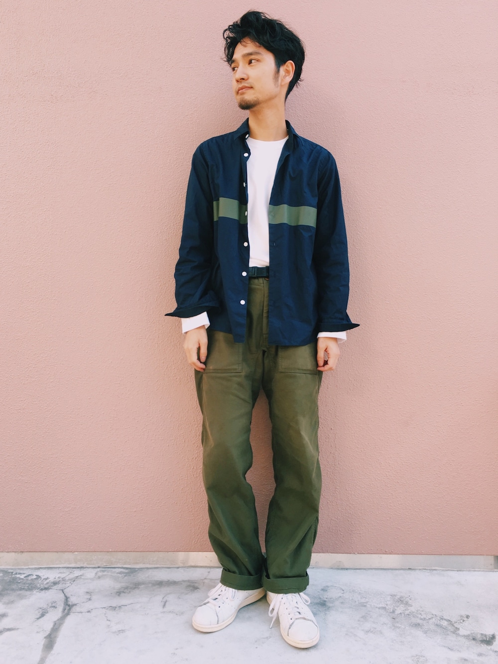 ネイビー×カーキ 白のロンTを挟んでアクセントに。