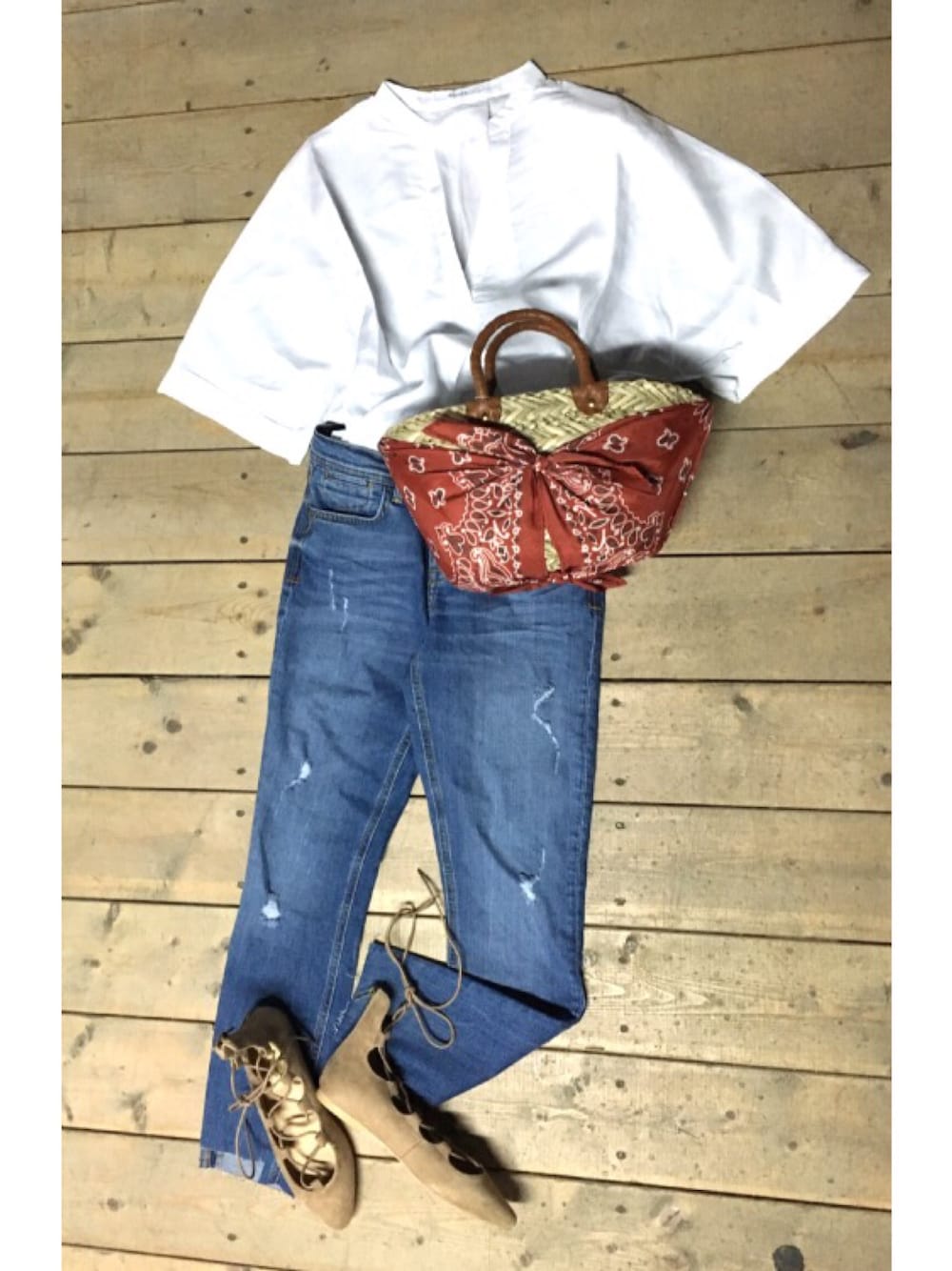 服がシンプルなので、カゴバッグでポイント❗️ トレンドは、レースアップシューズで