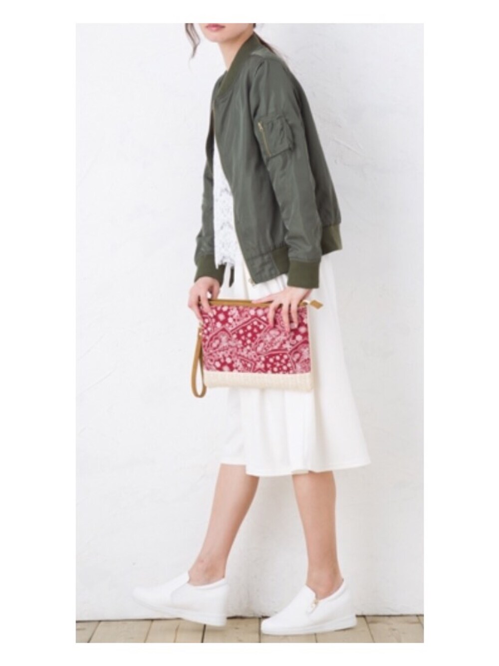 シンプルコーデに赤のバンダナ柄クラッチでポイント❗️